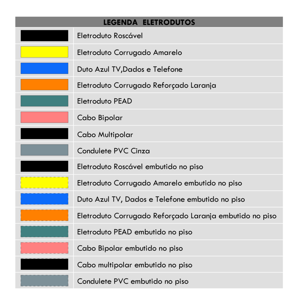 Também colocamos no projeto uma legenda de eletrodutos para indicar qual é o tipo que está sendo utilizado e sua forma de instalação, pois no Revit os eletrodutos e outros componentes são representados com o tamanho e cores reais aos que são utilizados na obra.