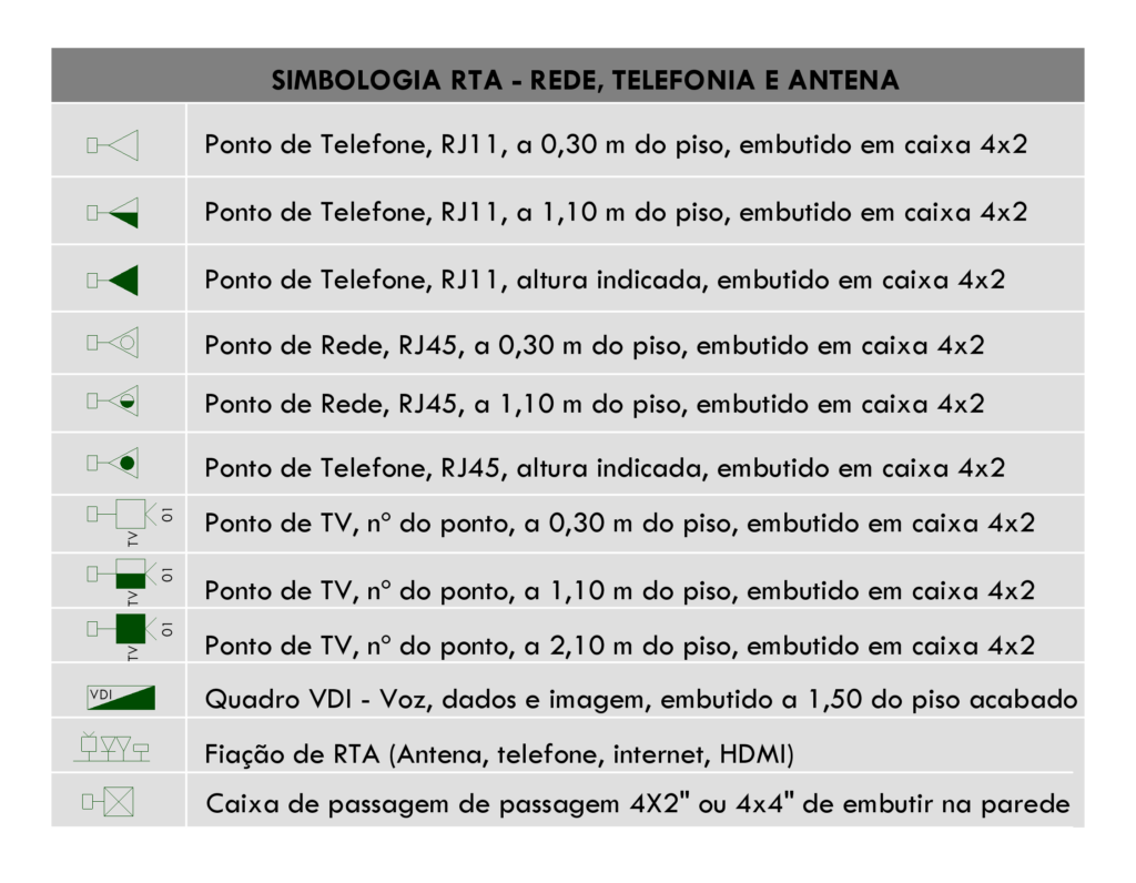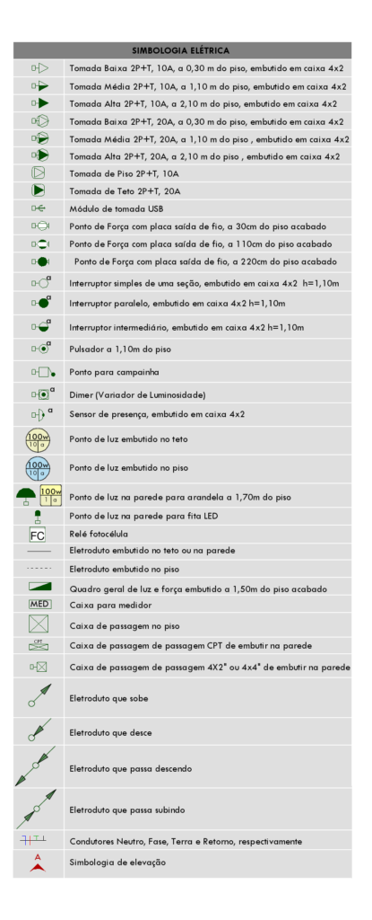 Todo projeto deve conter uma legenda de simbologias elétricas e de telecomunicações se houver e todos os pontos presentes no projeto devem estar contidos na legenda para facilitar a interpretação do pessoal da obra que irá executar essa instalação. Cada símbolo na legenda tem uma descrição e também informa a altura do ponto e forma de instalação, dessa forma fica fácil identificar esses pontos na planta baixa e saber a que se refere.