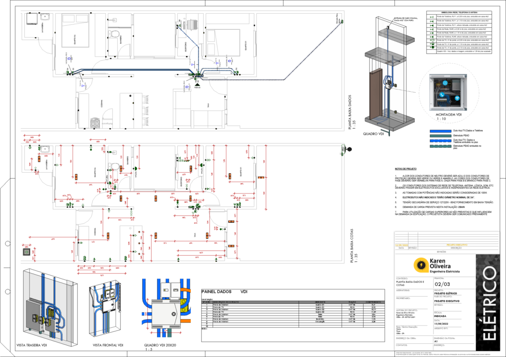 Plantas baixas: Com indicação da infraestrutura, eletrodutos e caixas de passagem, fiação e circuitos. Plantas mostrando somente a infra de rede, telefonia e antena, separada da rede elétrica e planta baixa com cotas.