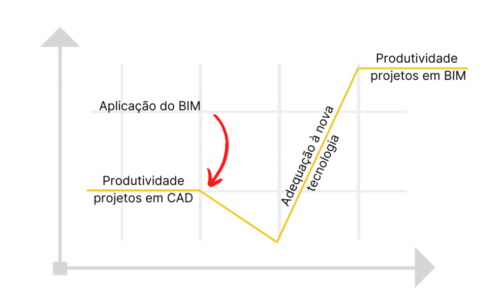 Todo o processo que citei anteriormente se enquadra nesse eixo do gráfico de adequação à nova tecnologia, com o passar das semanas você já começa a ter afinidade com o software BIM e a sua produtividade aumenta significativamente, você entra em um novo platô de produtividade.