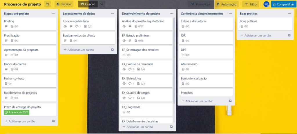 Para que você possa tornar o seu processo de projetos mais rápido no Revit Mep, você precisa de fato ter um Processo, definido e especificado em alguma ferramenta de gestão. Uma das ferramentas que utilizo para definir esse processo é o Trello, onde coloco todo o passo a passo de um projeto elétrico, desde o primeiro contato com o cliente até a entrega final.